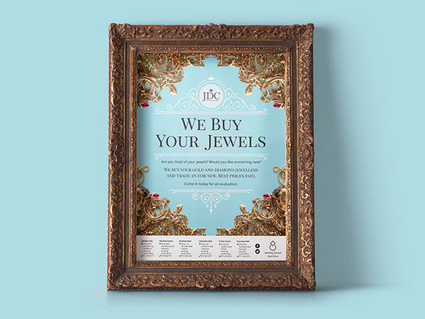 .Design a poster for JDC Jewellers informing the public that they buy used gold and diamond jewellery in exchange for cash, or new jewellery.